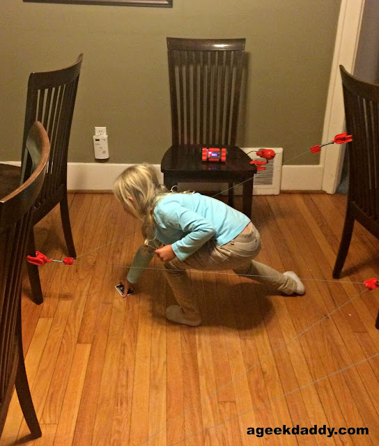 Chrono Bomb! brought out our inner 007 in this secret agent themed game. It was a nice change of pace to spend the evening playing something different from a board game or video game during our Family Fun Night. It was pretty funny to see some of the positions and moves players have to distort themselves in to get through the maze. Plus it got to be pretty competitive going head to head racing to get the best times. I have to say my kid's size was an advantage in crawling through and slipping around the "laser beams" and my daughter ended up the Chrono Bomb! champion for the night.
