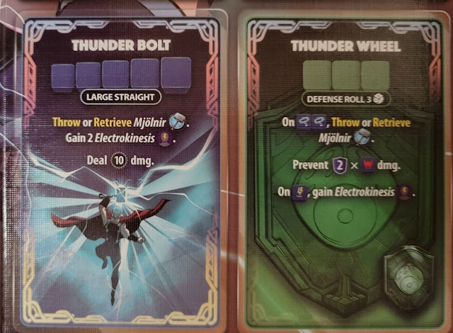 Thor has two status effects of his own: Guard Break and Electrokinesis. Utilizing Guard Break, Thor can roll one die after completing his offensive roll phase. If the outcome is 1-3, Thor's attack becomes undefendable! The Electrokinesis status effects can be used to boast Thor's abilities or cashed in to draw one action card.